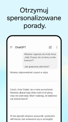 ChatGPT dostosowuje się do Twojego stylu życia, oferując intuicyjne interakcje. Aktywuj tryb głosowy, dotykając ikony słuchawek, by prowadzić rozmowy w biegu, opowiadać dzieciom bajki na dobranoc lub rozstrzygać dyskusje przy stole. Przesyłaj zdjęcia, by na przykład przekształcić pisany ręcznie przepis w tekst cyfrowy lub uzyskać szczegółowe informacje o zabytku, który podziwiasz. To wszechstronne narzędzie inspiruje do twórczości, pomagając znaleźć idealny prezent urodzinowy czy stworzyć spersonalizowaną kartkę.
